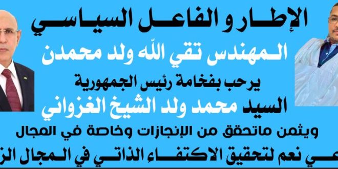 يدعو الإطار والفاعل السياسي المهندس تقي الله ولد محمدن كافة مناصريه للحضور اليوم الأربعاء 22/10/2025 في روصو لاستقبال فخامة رئيس الجمهورية السيد محمد ولد الشيخ الغزواني لانطلاقة الحملة الزراعية للخضروات 2025 و 2026