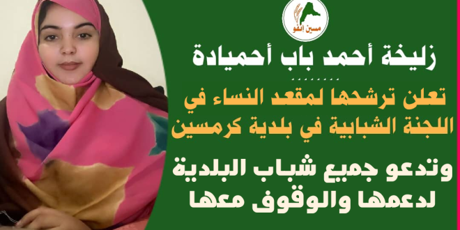 أعلنت السيدة زليخة أحمد باب أحميادة في بيان وصل مسين إنفو ترشحها للاستحقاقات الشبابية على مستوى بلدية كرمسين، المزمع تنظيمها خلال الفترة المقبلة، استجابةً لنداء فخامة رئيس الجمهورية الداعي إلى تمكين الشباب وتعزيز حضورهم في مراكز الفعل والتأثير.