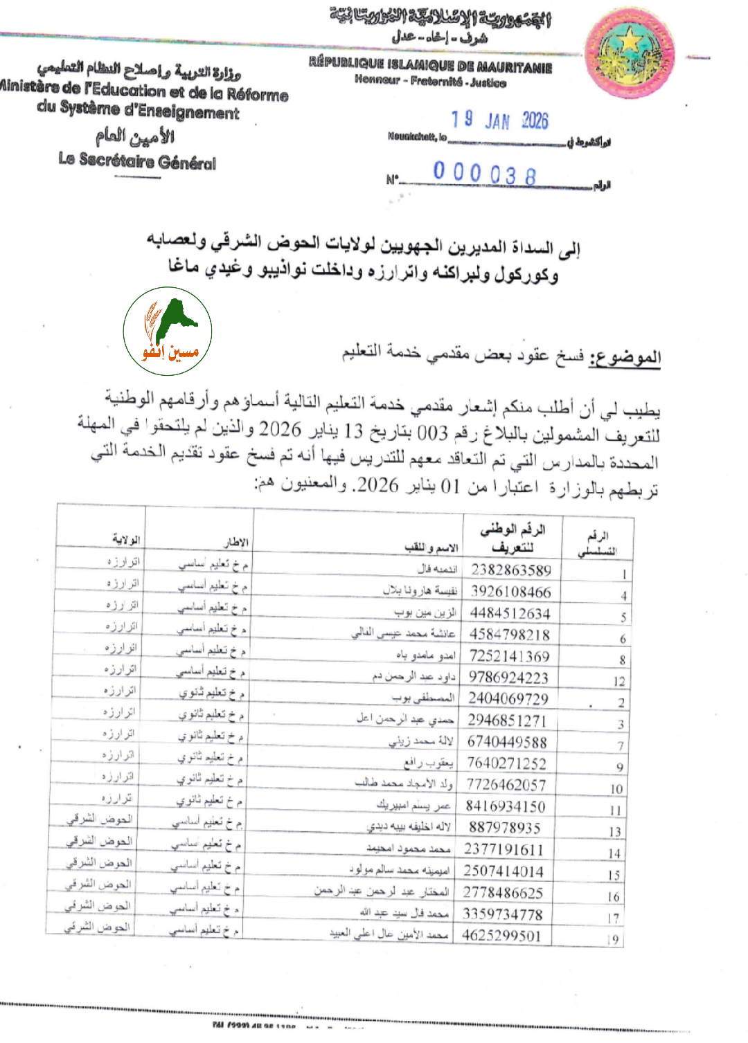 وجاء هذا القرار في رسالة وجهتها الوزارة إلى المديرين الجهويين لبعض الولايات، أوضحت فيها أن فسخ العقود يشمل المعنيين بالبلاغ رقم 003 الصادر بتاريخ 13 يناير الجاري، والذين لم يمتثلوا لمضمون البلاغ ولم يباشروا أعمالهم في الآجال المحددة.