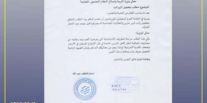 أودعت النقابة الحرة للمعلمين الموريتانيين SLEM اليوم الجمعة 13مارس رسالة رسمية لدى معالي وزيرة التربية وإصلاح النظام التعليمي تطالب فيها الوزيرة بتعجيل صرف راتب شهر مارس والعلاوات المصاحبة له قبل موعد عيد الفطر المبارك.