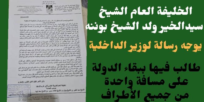 وجه الخليفة العام للطريقة القادرية في غرب إفربقيا الشيخ سيد الخير ولد الشيخ بوننه رسالة إلى وزير الداخلية الموريتاني طالبه فيها ببقاء الدولة على مسافة واحدة من كافة أطراف الأسرة الواحدة ، وندد الخليفة في رسالته بحضور شخصيات من المفترض أنها تمثل السلطة لأنشطة طرف وتتجاهل أنشطة الأطراف الأخر